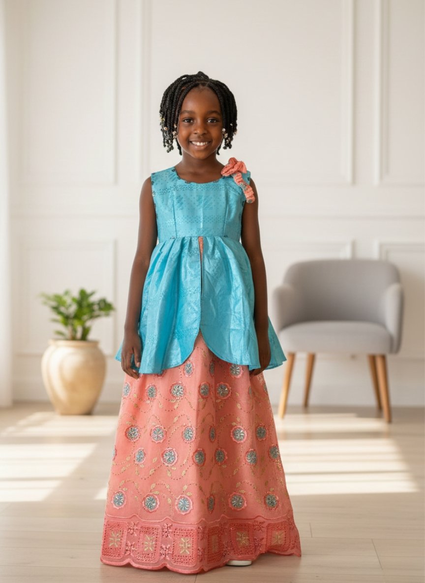 Élégante robe en bazin avec broderie lafaya, conçue dans une coupe chic qui met en valeur le style sénégalais.